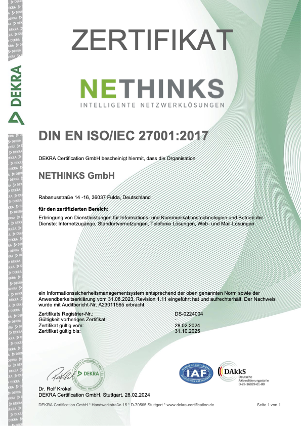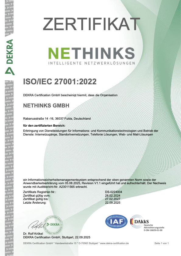 Im September 2025 haben wir bei NETHINKS erfolgreich unser ISO-27001-Zertifikat erneuert. Damit bestätigen externe Auditoren erneut, dass unser Informationssicherheits-Managementsystem höchsten Standards entspricht. Dieses Ergebnis ist das Verdienst unseres engagierten Teams, das kontinuierlich an der Optimierung unserer Sicherheitsprozesse arbeitet – auch neben dem normalen Tagesgeschäft.